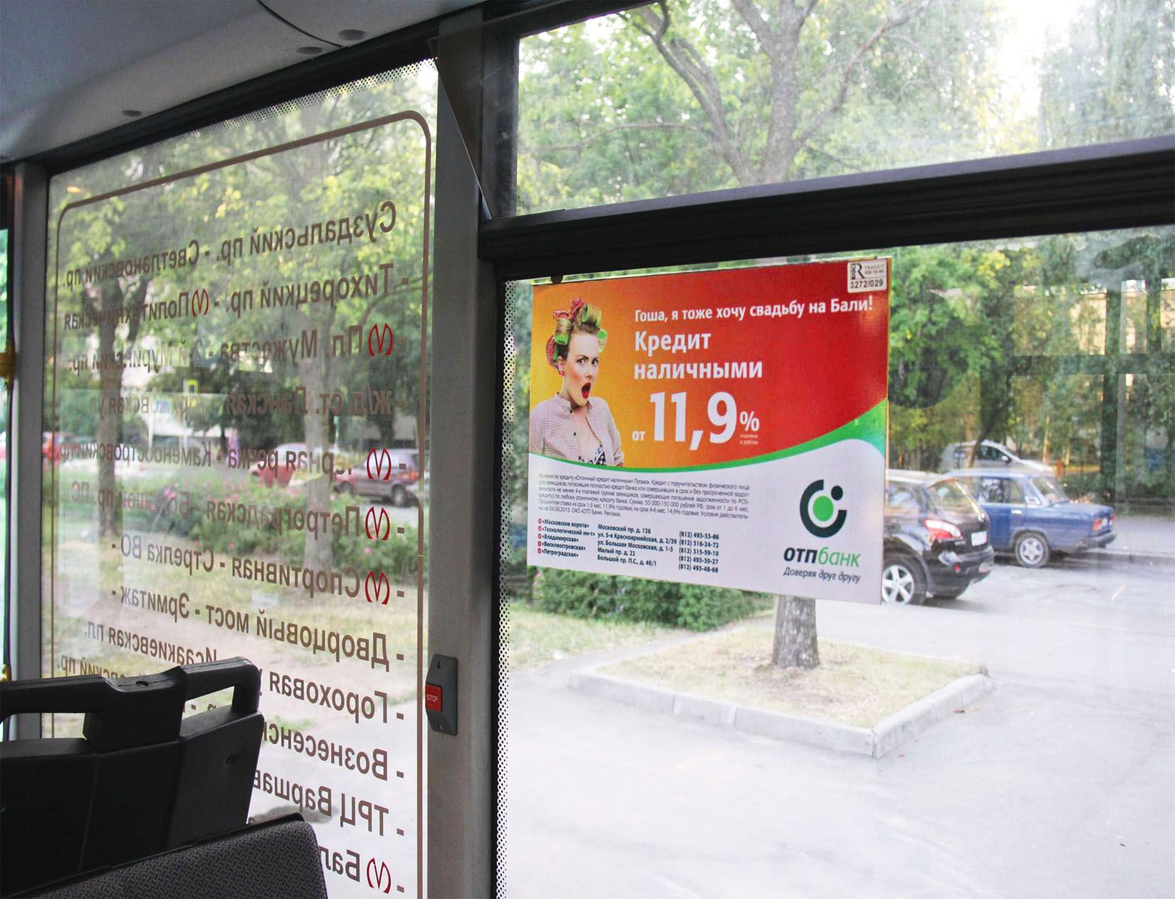 Как обеспечить массовый охват населения, размещая рекламу на транспорте, если денег на рекламу выделено не так много? В этом случае мы советуем использовать внутрисалонные форматы, а также брендирование заднего стекла или заднего борта транспортного средства. Указанные форматы являются относительно недорогими и по карману многим рекламодателям. Уверяем, что размещение рекламы на транспорте может себе позволить даже организация с небольшим рекламным бюджетом.