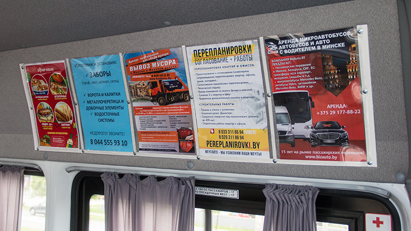Монтаж рекламы в маршрутках осуществляется по-разному в зависимости от того, какой рекламный материал и где размещается.