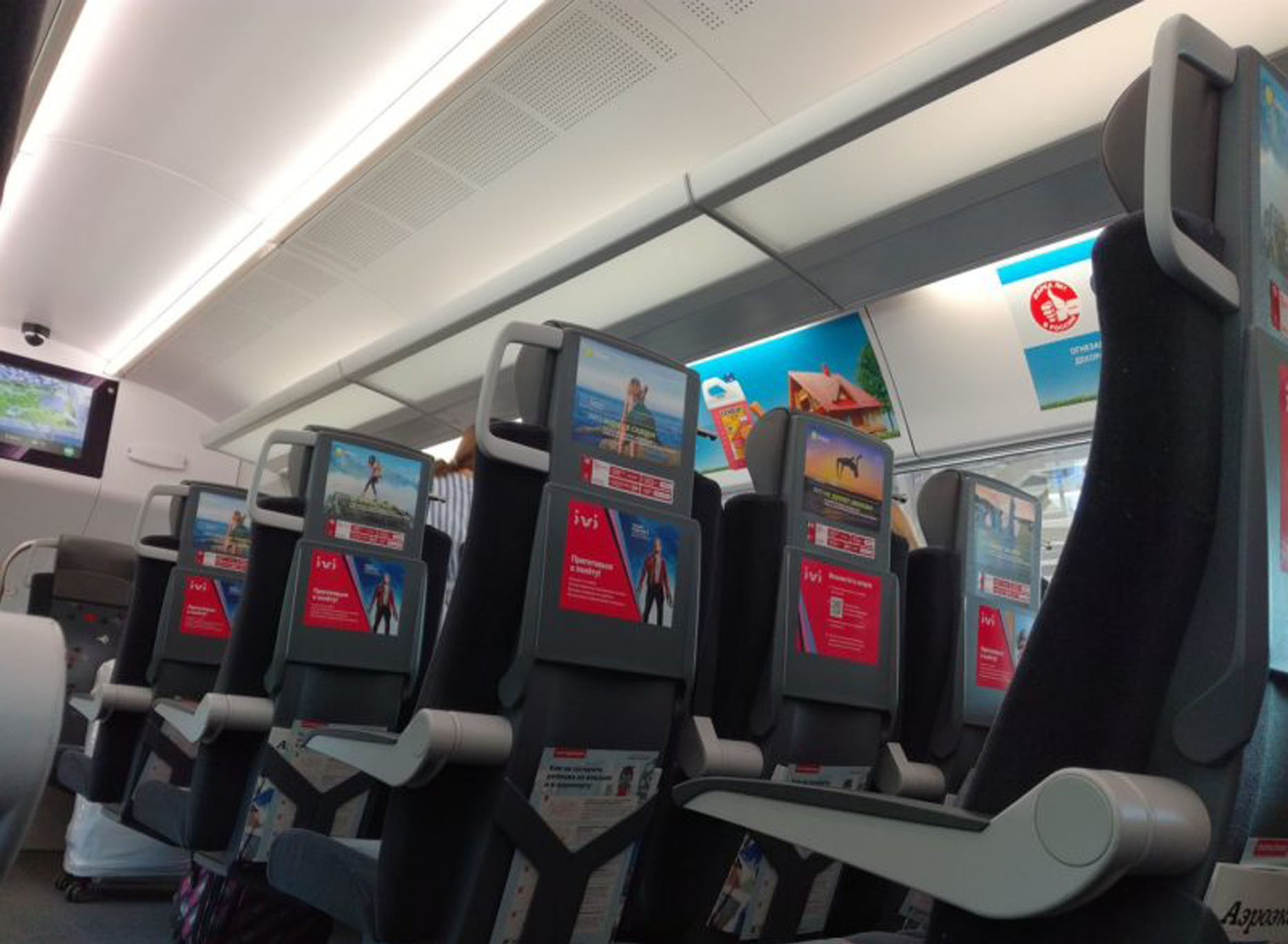 Реклама на спинках кресел в самолетах на фото выше