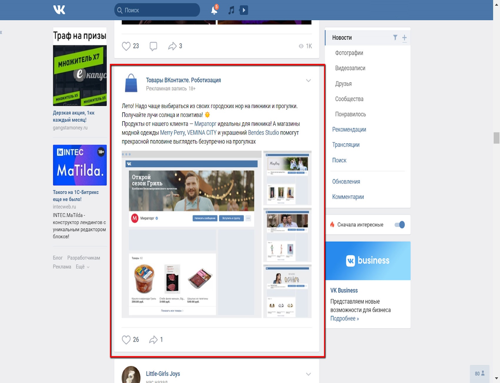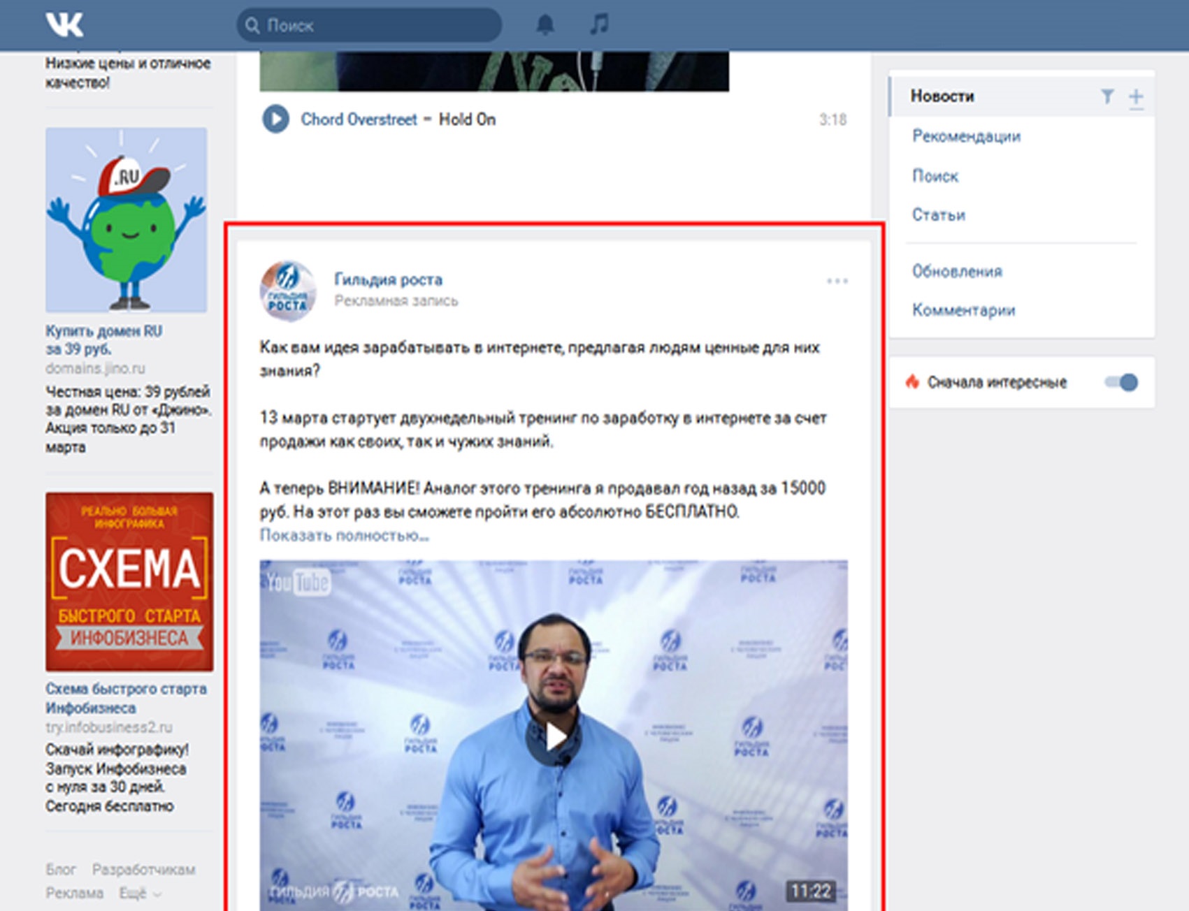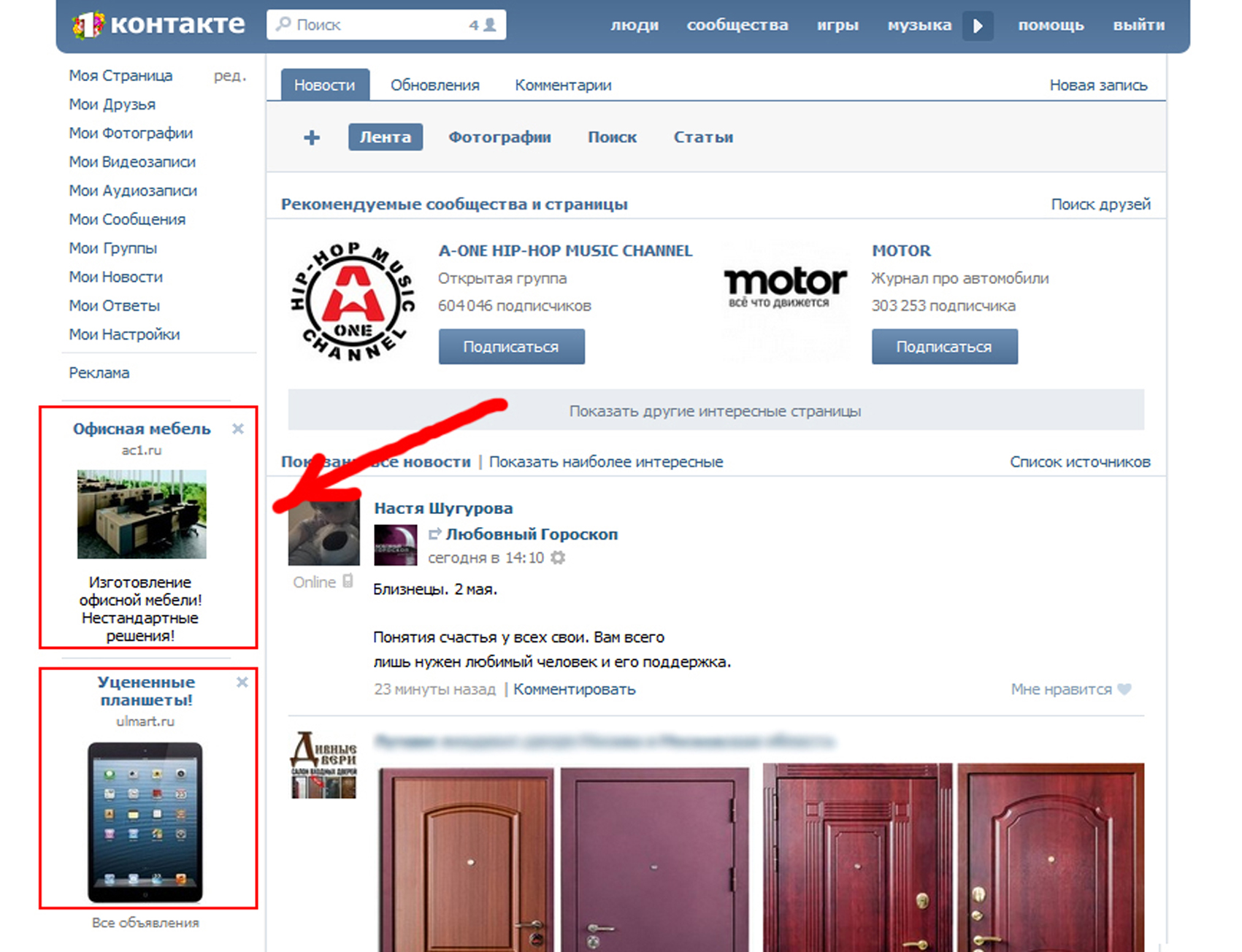 Выделяют следующие виды рекламных объявлений в ВКонтакте: